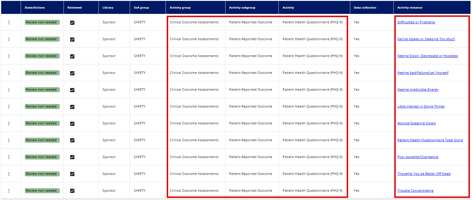 | State/Action | This column indicates the current status of an activity or activity instance, or the action required. Possible states/actions are: Review not needed, Review needed, Reviewed, Add instance, Remove instance, Not applicable, Reviewed |