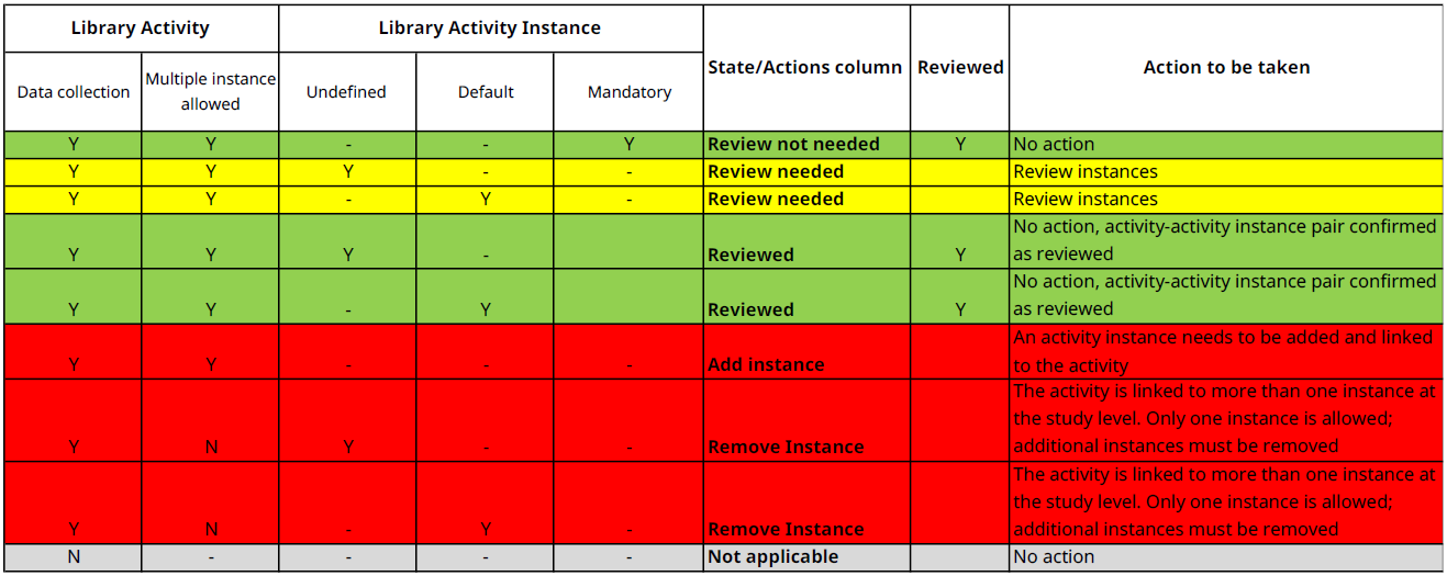 - Red: Remove Instance - requires user action; the activity may be linked to only a single instance at the study level