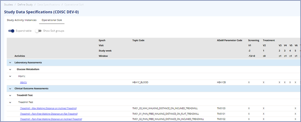 There is a fold-out option with expand or collapse all, and the option to expand within the groupings. On the activity instance level, the Topic Code and ADaM Parameter Code are visible. The activity instances carry a hyperlink to access additional instance information in the library.
