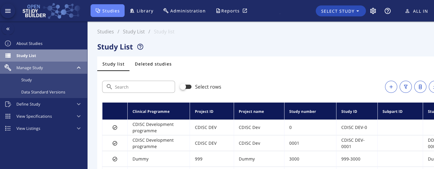 This user guide explains how to manage study definitions in the OpenStudyBuilder application. This is done on the Studies menu selecting Study List or Manage Studies.